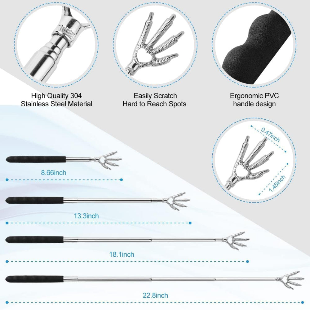 4-Pack Telescoping Back Scratcher Set – Extendable Metal Back Massager with Rubber Handles - Scratch hard-to-reach itches with ease using this 4-pack of telescoping back scratchers designed for comfort and convenience. Each extendable metal back massager features a smooth scratching head and ergonomic rubber handle for a secure, comfortable grip. Lightweight and portable, they collapse for easy storage at home, in the office, or while traveling. Durable construction ensures long-lasting use, making them perfect for everyday relief or sharing with family. A fun, practical gift idea for men and women, these scratchers are great as stocking stuffers or small holiday surprises.