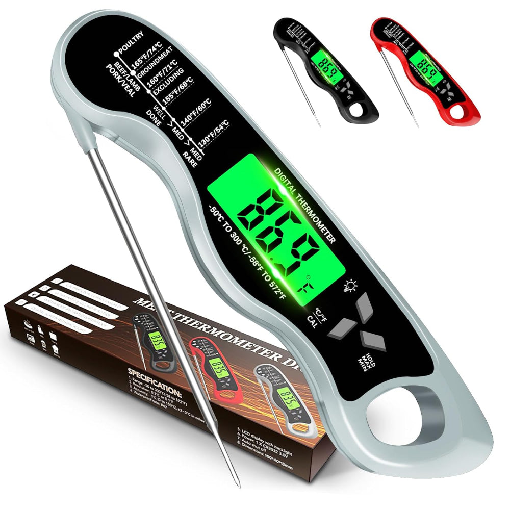 - THE DETAILS ARE EVEN MORE THOUGHTFUL - the digital meat thermometer is easy to operate and can be used by opening the probe. It will automatically shut down after three minutes of non-use to extend the battery life. The magnet and hanging hole design of the instant reading thermometer make it more convenient to store; the handle of the thermometer is also ergonomically designed, easy to grip, making every cooking a pleasure.